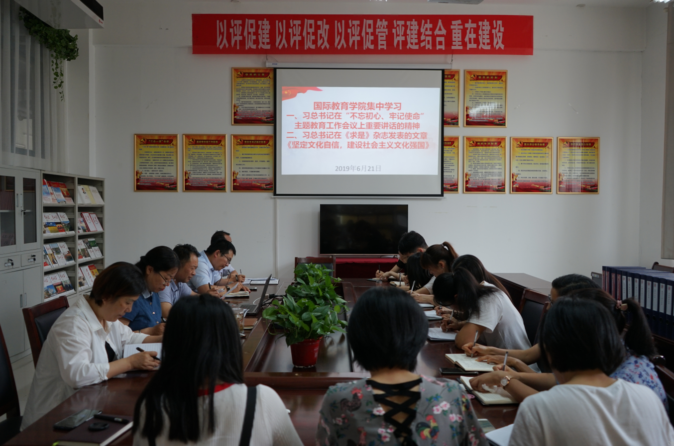 6月21日下午,tyc122ccvip在党员活动室召开学习习近平总书记在“不忘初心、牢记使命”主题教育工作会议上重要讲话精神暨习近平总书记在《求是》杂志上发表的署名文章《坚定文化自信,建设社会主义文化强国》专题会议。党总支书记李秀琴、经理任付标、副书记宁智锋、副经理曹庆艳、王军强以及全体教职工参加会议。会议由党总支书记李秀琴主持。
