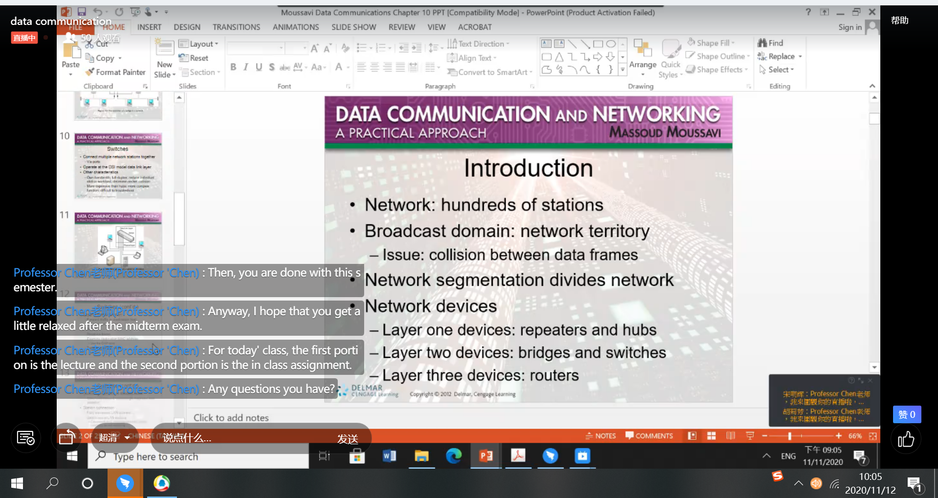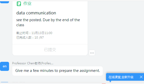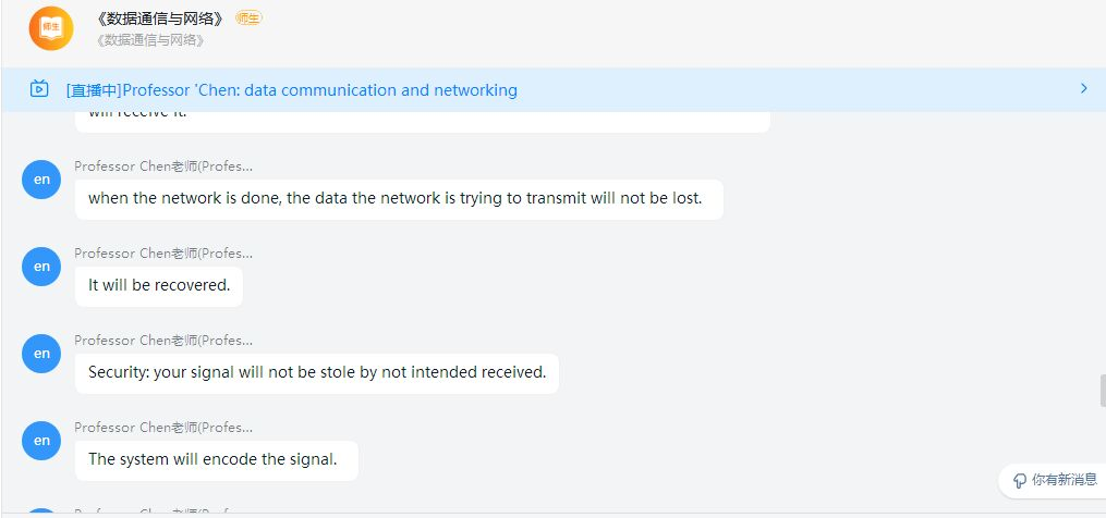 Chen老师克服时差,昼夜颠倒,认真备课,在钉钉软件上为18级软件工程同学们准备了30个课时的纯英文数据通信与网络线上课程。在课堂上,教学经验丰富的Chung Hao Chen博士用诙谐幽默的语言,灵活的教学方式,让同学们对数据通信与网络这门课程产生了浓厚的兴趣,纯正的口音更让同学们领略到英语的魅力。另外还通过线下作业的形式帮助员工们巩固课程,加深同学们对数据通信与网络的喜爱。
