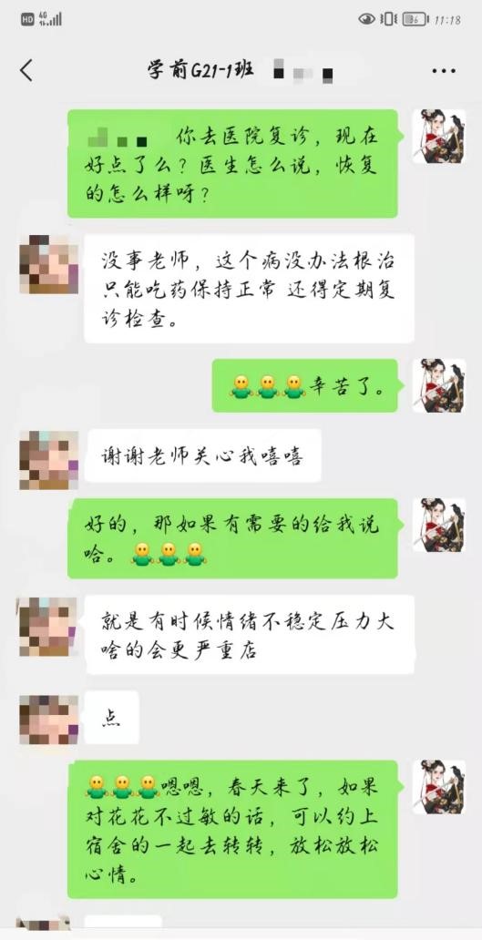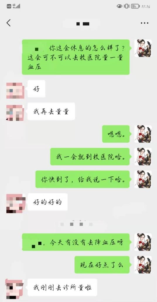 “谢谢老师关心,我的血压已经降下来啦”,看到这样的信息,一颗悬着的心终于落了下来。员工在校,当然有时偶尔也有一些小状况出现,会出现这样那样的身体不适,每当这个时候,第一时间协调安排就医,安抚员工情绪,就是我的首要工作。就医返校后,我则每日一问身体恢复情况,在得到肯定回答后,像“老母亲”一样欣慰的露出笑容,就是我当时写照。
