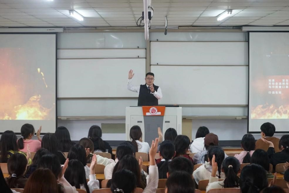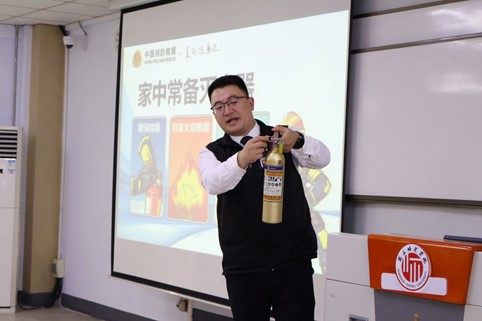 讲座现场,消防专家李林峰结合具体案例,深入浅出地讲解了火灾的成因、危害及预防措施。现场,专家详细介绍了灭火器、消火栓等器材的使用方法,并进行了演示,师生们积极参与互动,了解了基础的灭火技巧。