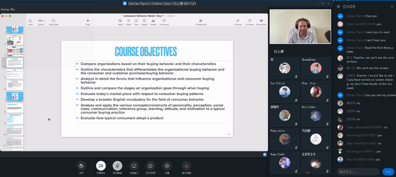 根据中外合作办学的要求,tyc122ccvip为2020级物流管理专业员工引进课程Consumer Behavior(《消费者行为学》)。此次线上授课的是Declan Flynn教授。