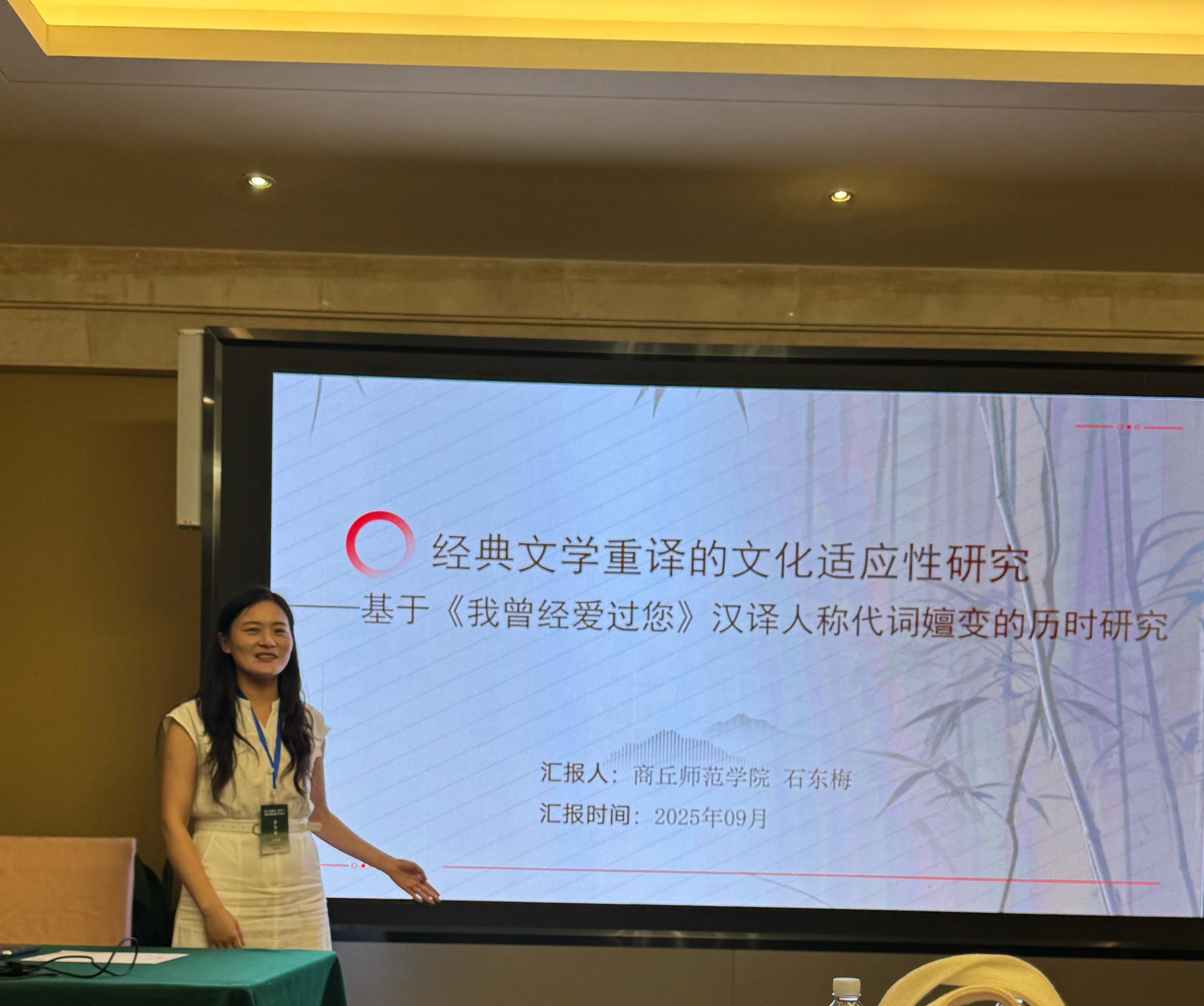 论坛围绕中国对外话语体系构建、AI时代翻译理论与实践创新、经典文学重译等11项子议题展开深入研讨。石东梅老师以《经典文学重译的文化适应性研究——基于〈我曾经爱过您〉汉译人称代词嬗变的历时研究》为题进行论文汇报。石老师在发言中从微观语言层面切入,以普希金抒情诗《我曾经爱过您》的多个汉译版本为案例,系统梳理了从戈宝权、查良铮到刘文飞等译者在人称代词选择上的嬗变轨迹,深入剖析了“你”与“您”背后所反映的文化适应机制与时代接受语境。