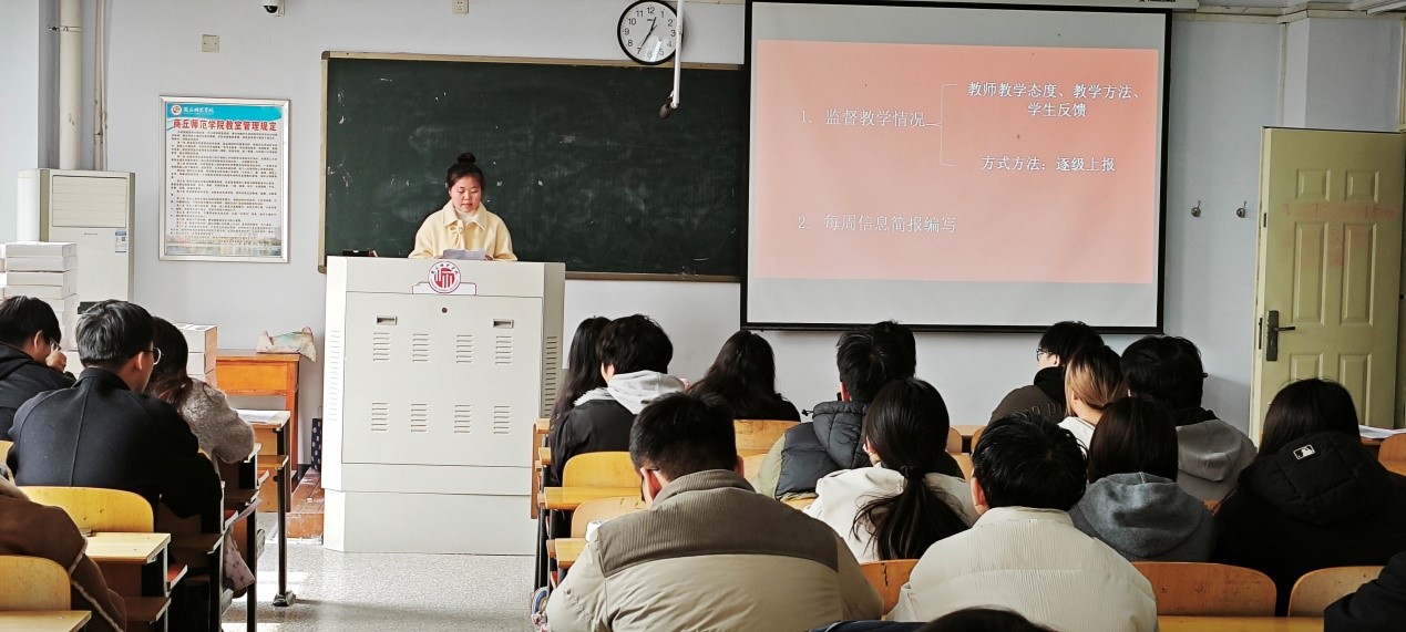 会议分为两个环节展开。首先,王静静老师系统阐述了教学信息员的工作职责,明确需重点监督课堂教学规范、教学设备维护及师生互动成效,并定期编写每周教学信息简报,确保问题反馈的时效性与精准性‌。随后,优秀员工信息员代表结合具体案例,从信息收集方法、沟通协调技巧及突发事件处理等方面分享经验,为新任信息员提供实操指导‌。