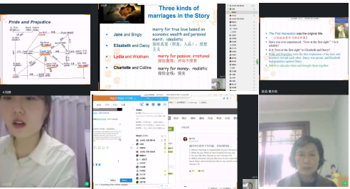 课前,曹庆艳老师在QQ群和学习通发放相关视频文件并督促员工思考相关问题,使大家对本课内容获得初步认知。课程伊始,段静同学向大家报告了第四组对故事文化背景和人物关系的基本调研,曹老师对汇报内容给予了肯定。之后,她对本章节做进一步深入讲解。通过幽默生动的语言,曹老师为大家介绍了Jane Austen的生平及其通过Pride and Prejudice中传达的婚恋观和价值观。她利用详实的图文资料、选取原文片段,对主要人物做了深入分析。老师的讲解吸引了同学们极大兴趣,大大降低了对所学内容的理解难度。曹老师还通过学习通发布讨论话题,让同学们自由发表自己的见解和看法。在线教学由浅入深、生动形象,网络互动形式巩固了大家对知识点的掌握,加深了同学们对作品内容的理解,为大家带来了一堂有趣的文学课。