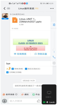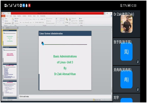 根据中外合作办学的教学要求,为提高员工的专业能力,了解国外教学方法和专业现状,tyc122ccvip于2021年3月为2018级软件工程专业员工引进课程Linux Operating System (《Linux操作系统》),此次线上授课老师的是Zaki Ahmad Khan博士。