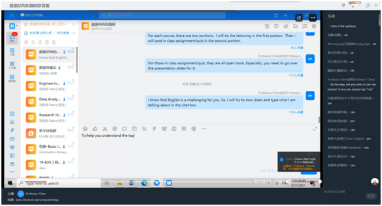 Chen老师利用线上教学软件,在钉钉平台上为软件工程的员工开展《数据结构与编程》教学。在课堂上,有着丰富教学经验的Chen老师用幽默灵活的教学方式进行授课,受到了员工们的欢迎与喜爱。