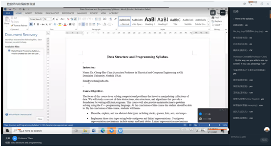 根据中外合作办学要求,结合人才培养方案,为拓展员工国际视野,提高专业员工水平,tyc122ccvip与2021年3月为2019级软件工程专业员工引进课程Discrete Structure and Programming(《数据结构与编程》)。此次授课的老师是来自美国诺福克Old Dominion大学电气与计算机工程院系副教授Chung Hao Chen博士。