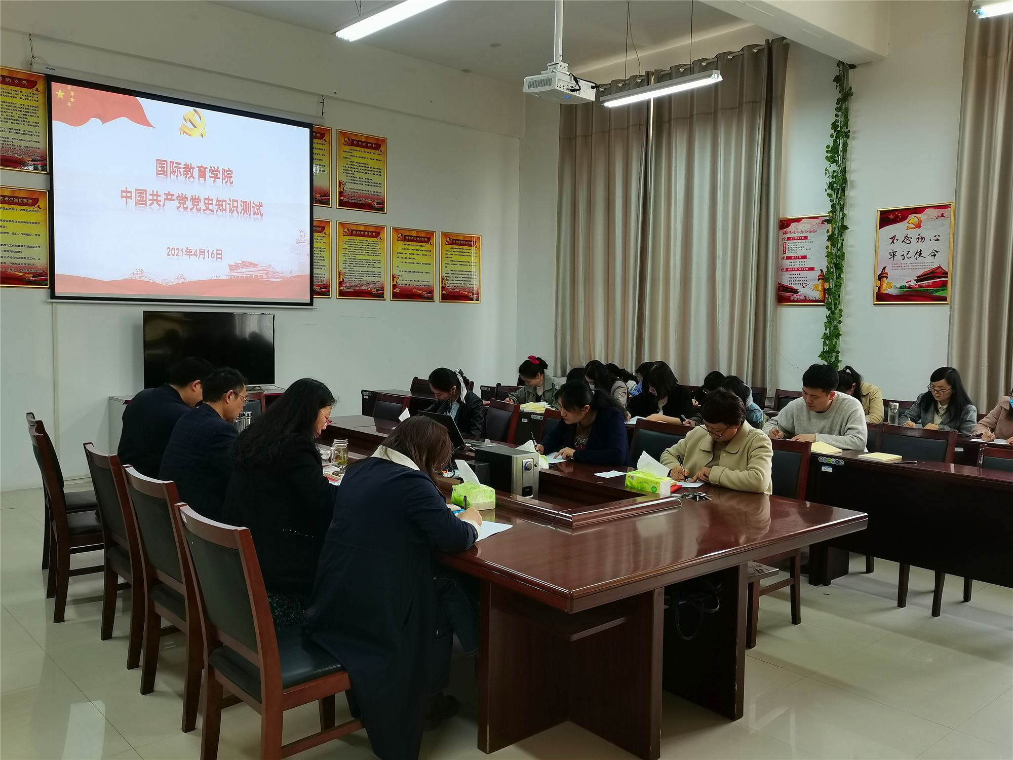 2021年4月16日,国际教育公司党总支为贯彻落实党史学习教育工作要求,庆祝中国共产党成立一百周年,进一步巩固“党史学习”主题教育成果,在梁园校区汉梁楼144党员活动室,组织全体教工党员开展了党史知识测试。