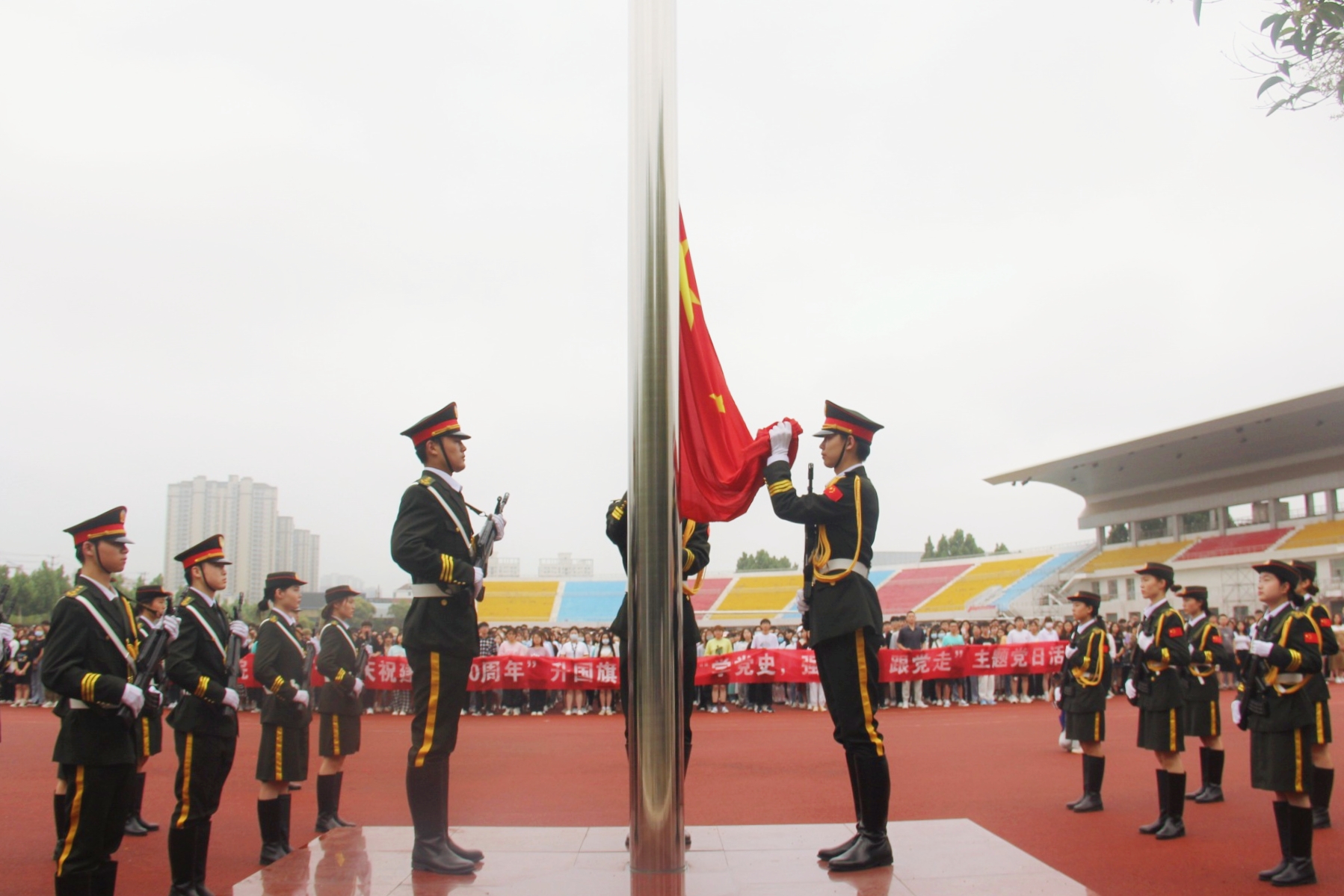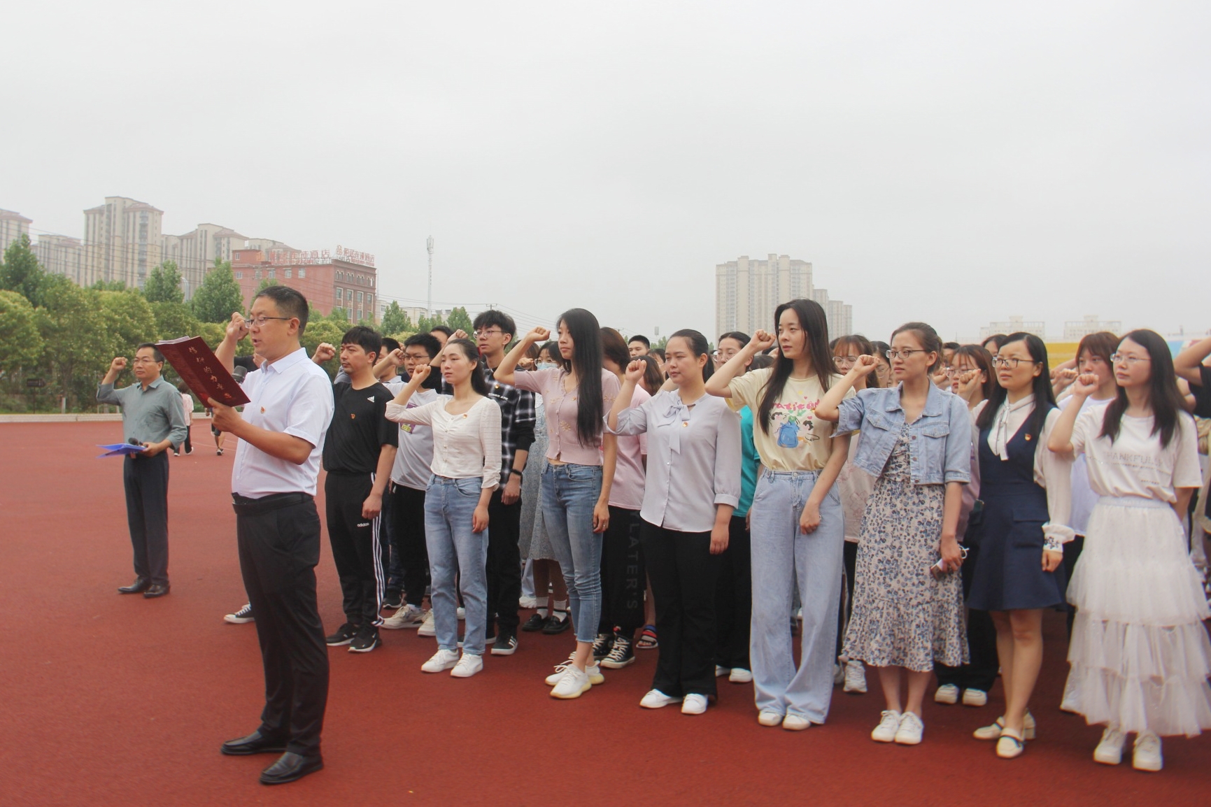 为迎接党的百岁生日,庆祝建党100周年,6月15日早上,tyc122ccvip在梁园校区体育场开展“迎七一,庆祝建党100周年”升国旗仪式暨“学党史,强信念,跟党走”主题党日活动。员工处处长王晓征、公司领导班子成员、全体师生3400余人参加活动,经理周运增主持活动。