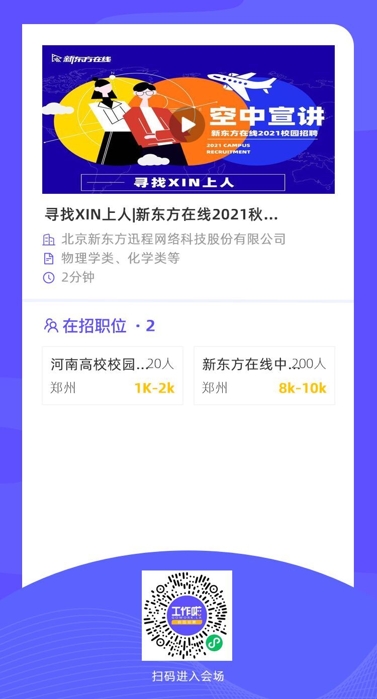 空宣开始啦 各位21届的小伙伴们,你是否因步入大四面临求职而不知所措呢?你是否因不知道在哪找到最合适的工作而心怀迷茫呢?学而思网校携重磅优质岗位为你而来 强][强]【9月22日19:00线上宣讲会,准时开讲!】本次宣讲会上所有投递简历的同学,全部免筛选,直接进入面试!直播现场更有多份大礼包 送给幸运的你~小伙伴们赶紧呼朋唤友,扫码进群,搬好小板凳期待宣讲会的开始吧!(线上宣讲会qq群号:825429938)