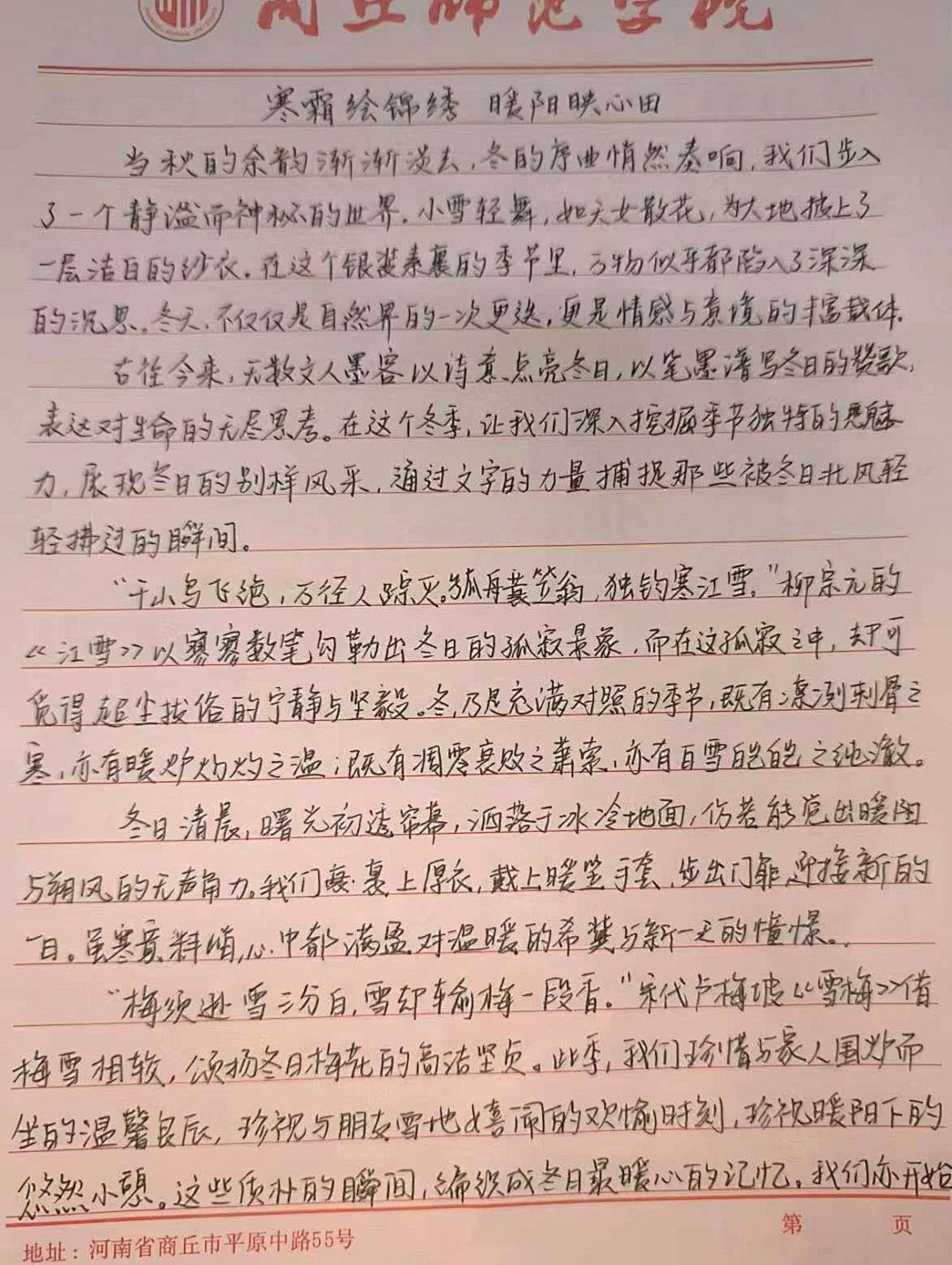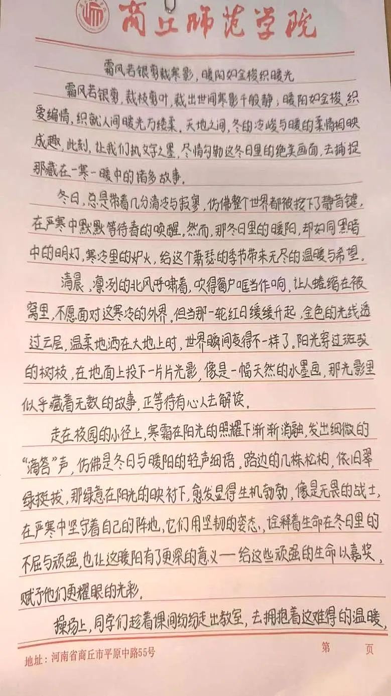 为增强同学们对节气的理解,归德书院员工会学创部于11月22日在归德文化广场举办了招商公路“C Green”杯“暖阳照耀,文绘冬日”征文比赛。