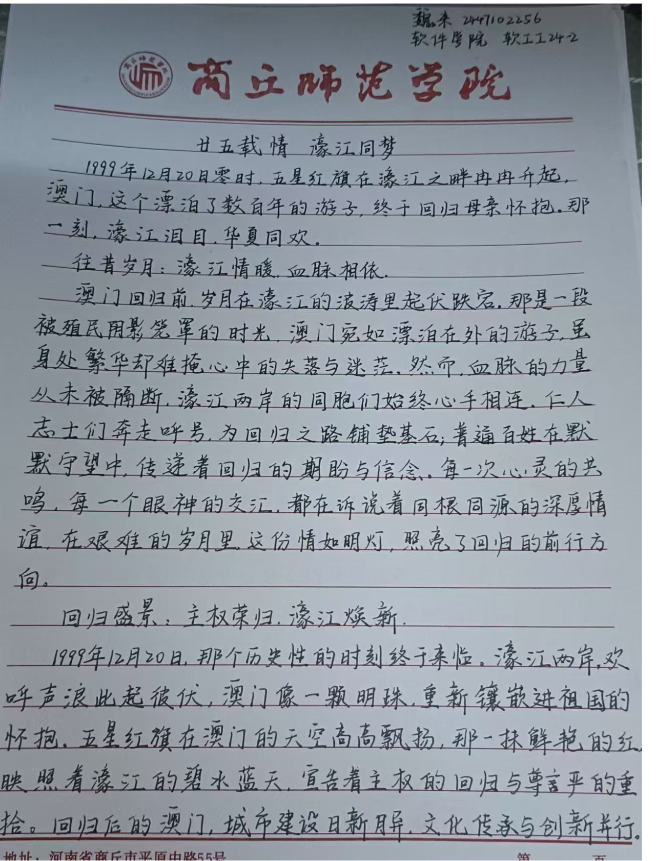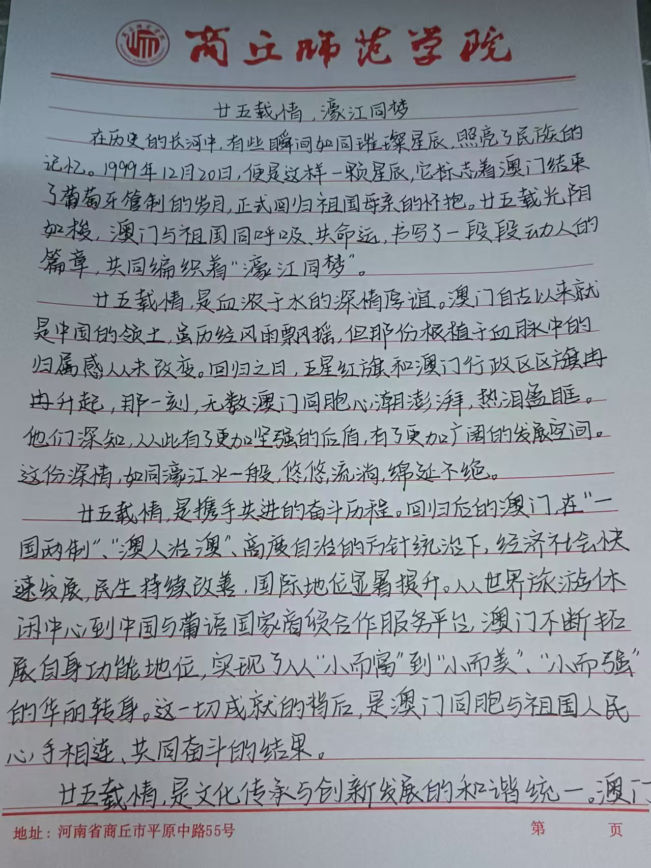 比赛期间,参赛同学们聚焦澳门的历史文化底蕴,着眼于澳门回归后的城市发展新貌,以笔为媒,描绘了对澳门更加繁荣发展的美好憧憬,抒发了对澳门回归二十五载光辉历程的深情礼赞。比赛结束后,办公室工作人员根据比赛细则评出了一等奖三名,二等奖四名,三等奖五名。